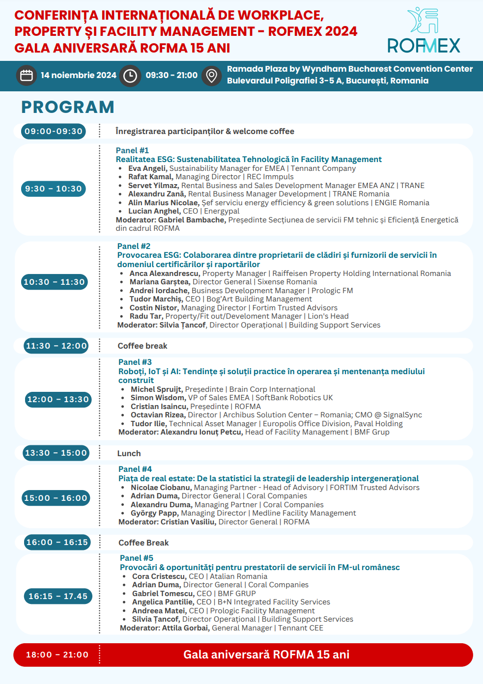 Pe 14 noiembrie 2024 are loc Conferința Internațională de Workplace, Property și Facility Management organizată de ROFMA - Asociația Română de Workplace și Facility Management (www.rofma.ro) în cadrul ROFMEX 2024.